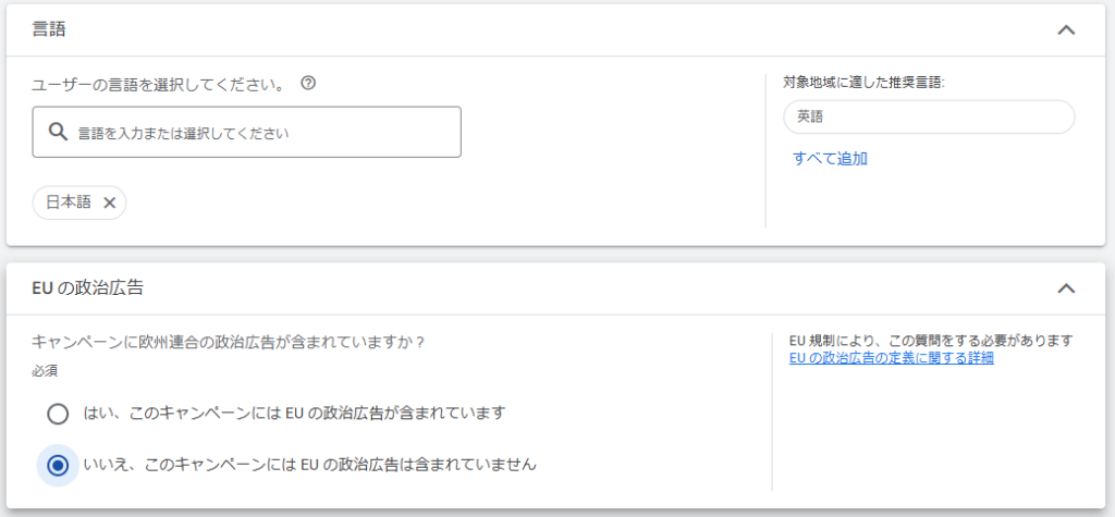 ・言語も日本語のみを設定する(右側の英語は必要なければこのまま)。EUの政治広告は「いいえ~」を選択