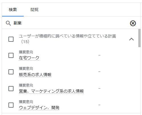 ・ここでは「副業」を入れてみました。すると下に関連項目が出てきます。