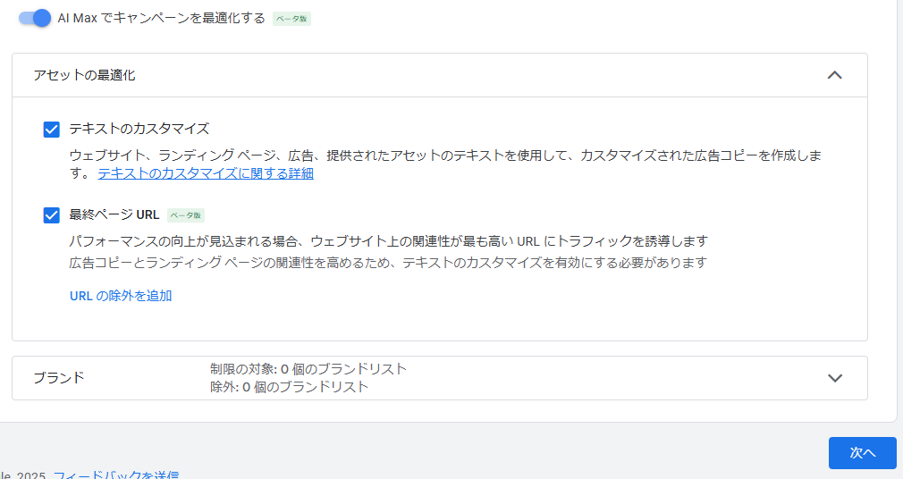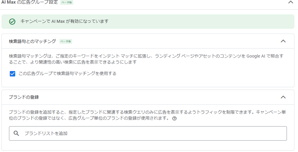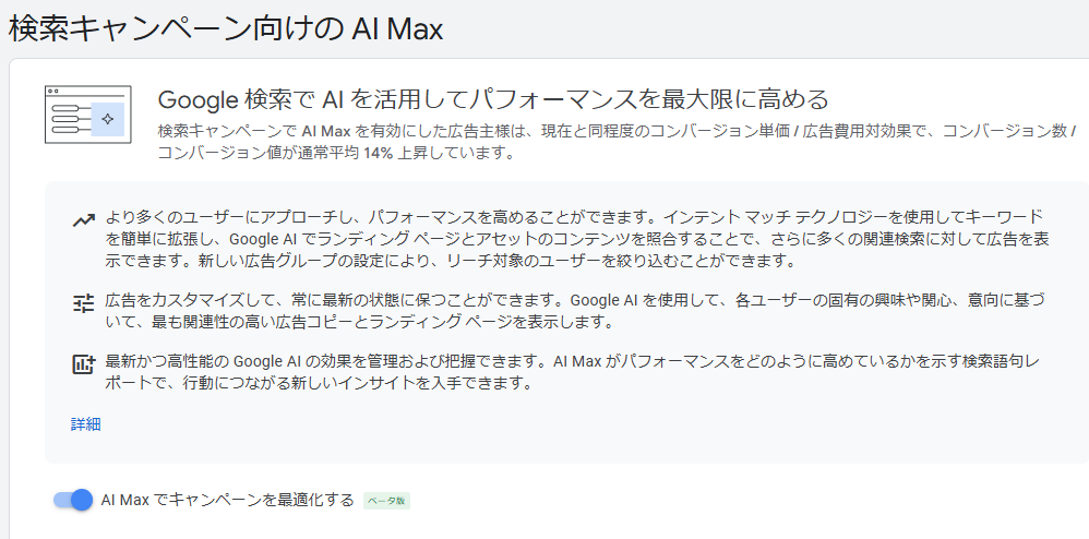 ・検索ワードなどをAIが自動判断してくれます。AIMAXをオンにします
