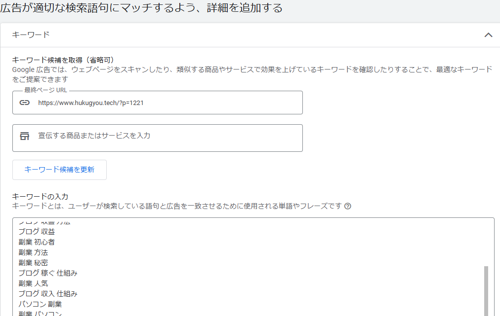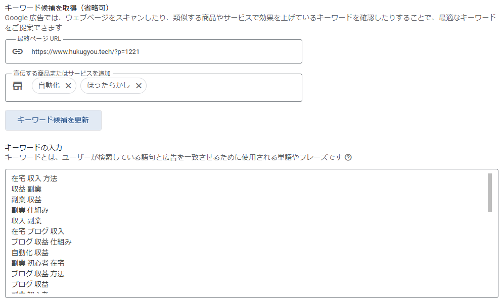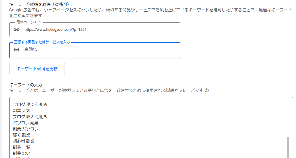 ・追加したいキーワードを入れて「キーワード候補を更新」を押します。(自動化を入れました)