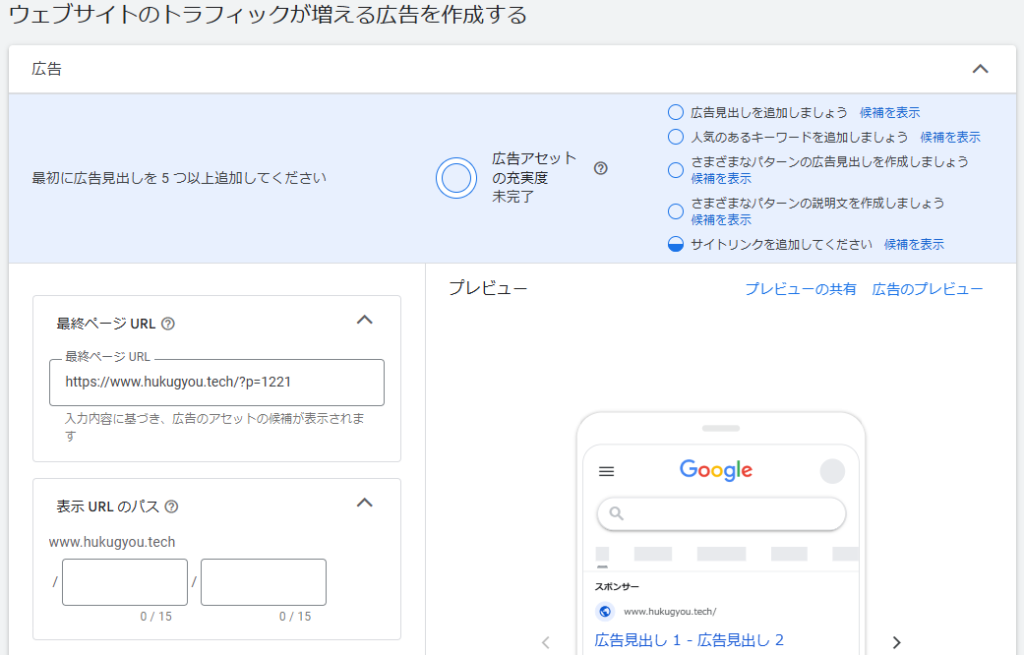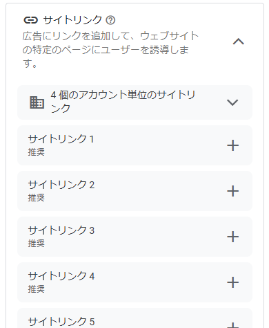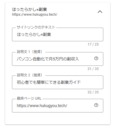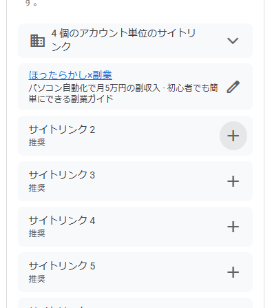 ・サイトリンクをいれます。サイトリンクは4つ入れることを推奨します。かなりアピールできます。(ここでは1個いれます)