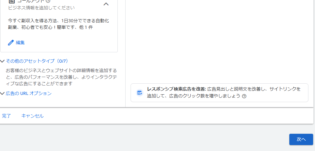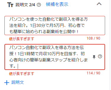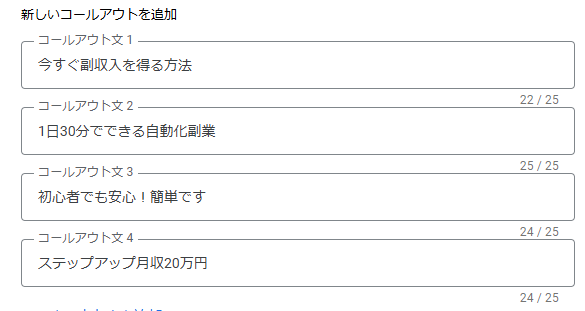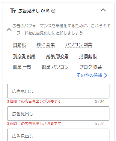 ・ここまでで一通り完成ですが、おそらく上部に広告見出しを増やすように指示が出ていると思います。ボタンをクリックし、キーワードを追加します。