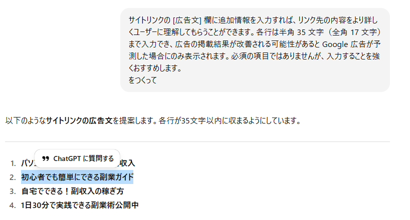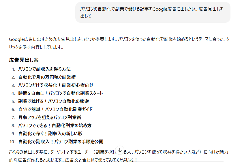 ・広告の見出しはCHAT-GPTなどに以下のプロンプトなどで作ってもらいます。