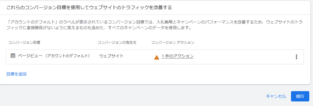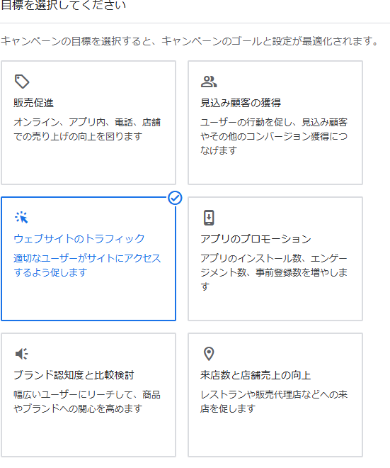 ・目標の選択がでます。アフィリエイトであれば、「ウェブサイトのトラフィック」がおすすめ。個人店などであれば該当するものをクリックする