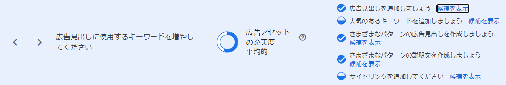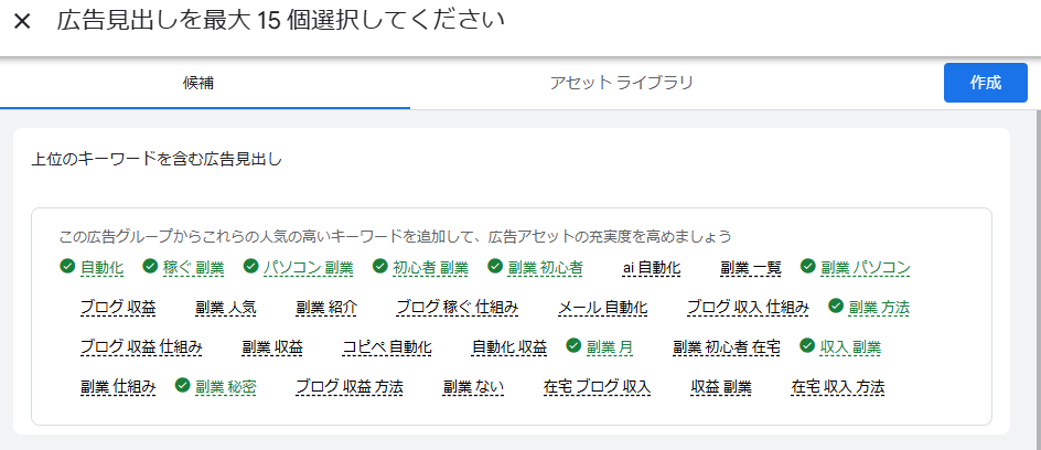・エラー画面の一番上の「広告見出しを追加しましょう」にチェックが入ったらOKです。ほかの項目にもチェックが入ると思います。