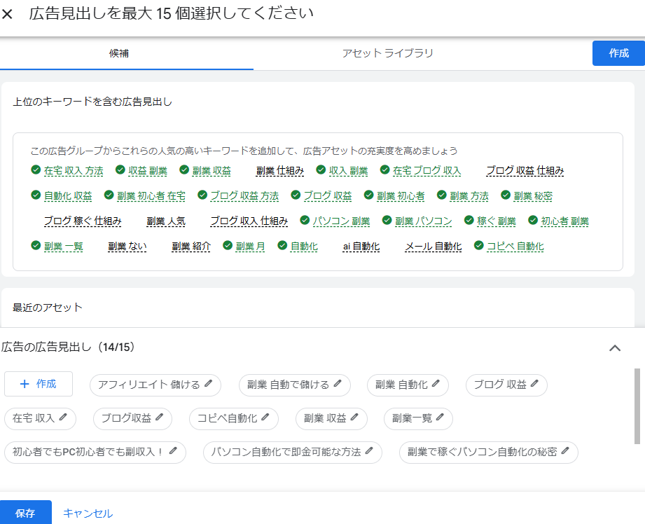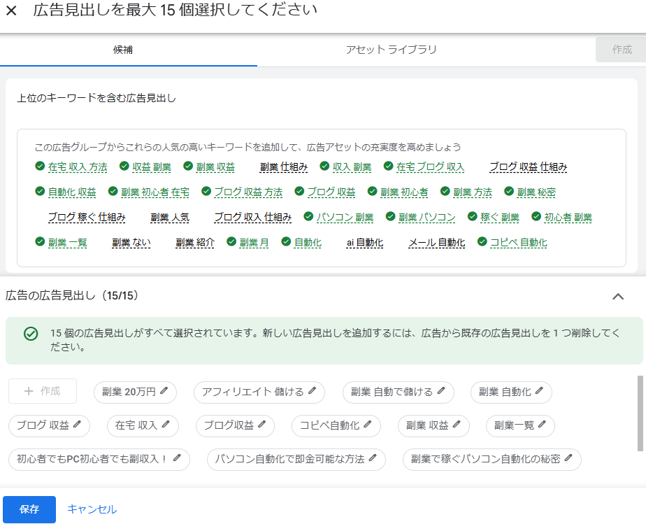 ・キーワードが増えていきますので、繰り返して15個設定します(設定できたら下の「保存」ボタンを押す)