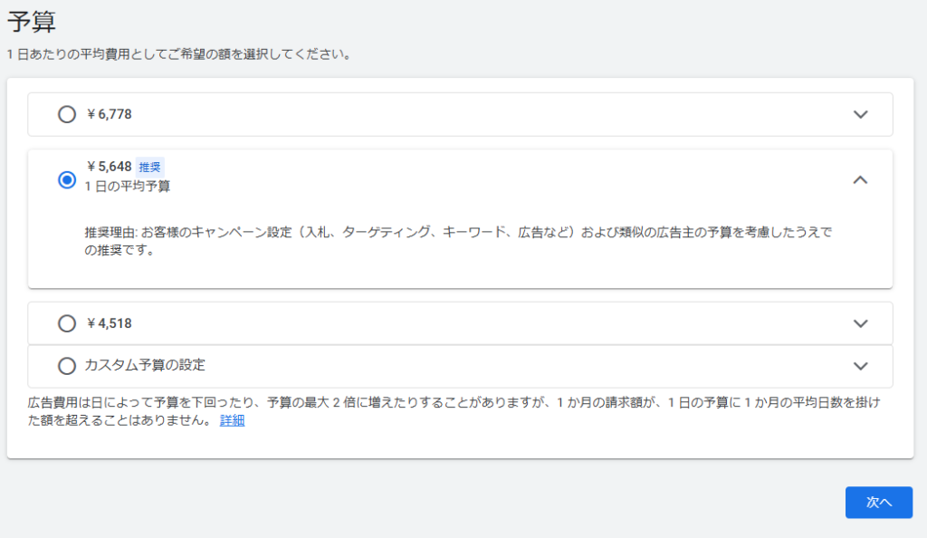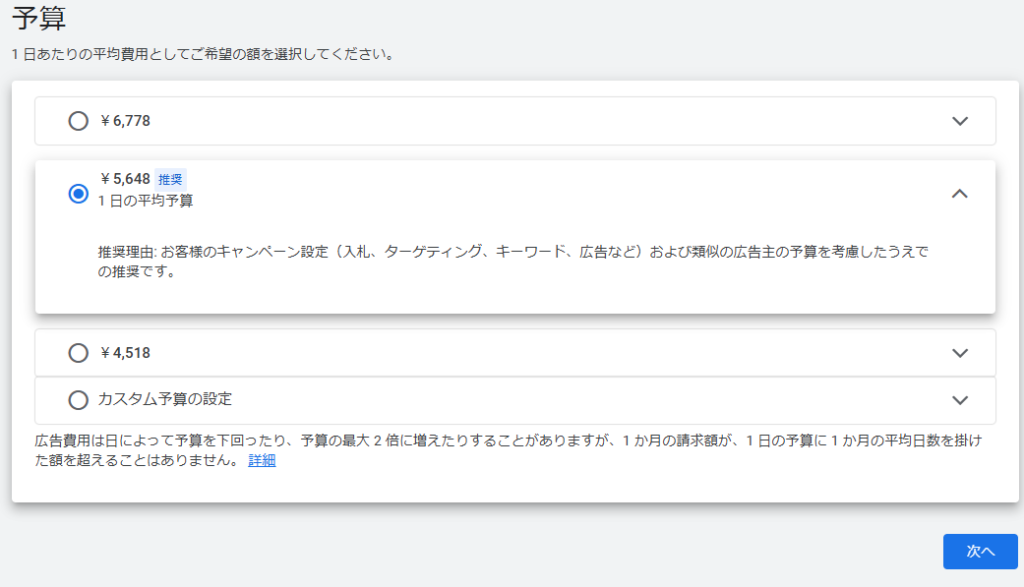 ・予算の画面になります。推奨がよいと思いますが、1日の予算を設定します。「カスタム予算の設定」もできますが、解析できなくなるのであまりお勧めしません